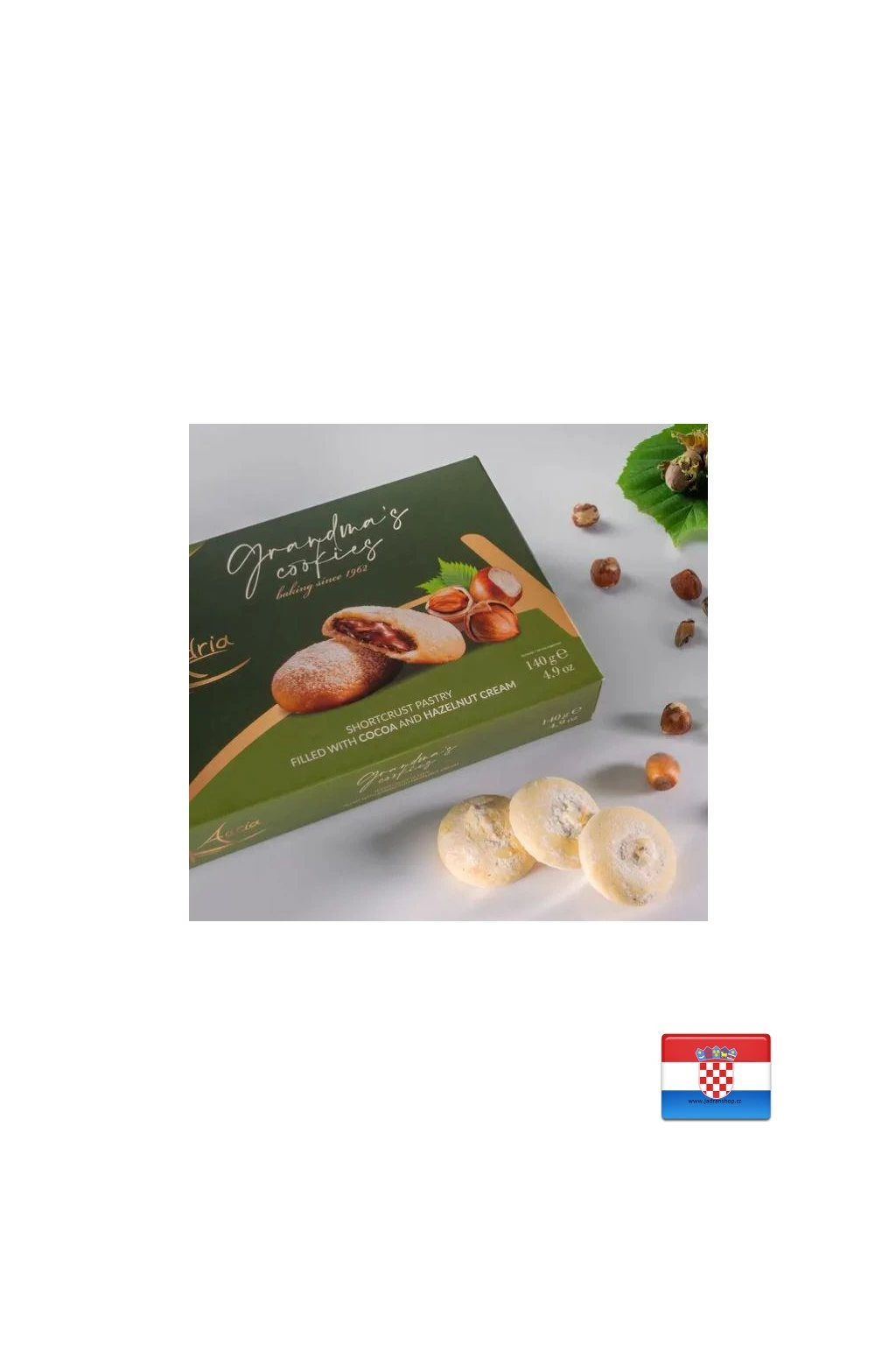 Složení: hladká pšeničná* mouka typ "0", kakaová a oříšková krémová náplň 30% [cukr, rostlinné oleje a tuky (oleje (slunečnicové), tuky (kakao)), lískové ořechy 10%, kakaový prášek se sníženým obsahem tuku 8%, mléko v prášku, emulgátor: slunečnicový lecitin; přírodní oříškové aroma], margarín [rostlinné oleje a tuky (palmový olej, slunečnicový olej), voda, emulgátory: mono a diglyceridy mastných kyselin], cukr, vejce, moučkový cukr 3% (sacharóza, kukuřičný škrob), máslo, kypřící látky : difosforečnan sodný, hydrogenuhličitan sodný; sůl, sušené odstředěné mléko, aroma: vanilin; barvivo: beta karoten. Může obsahovat stopy sóji a ořechů.