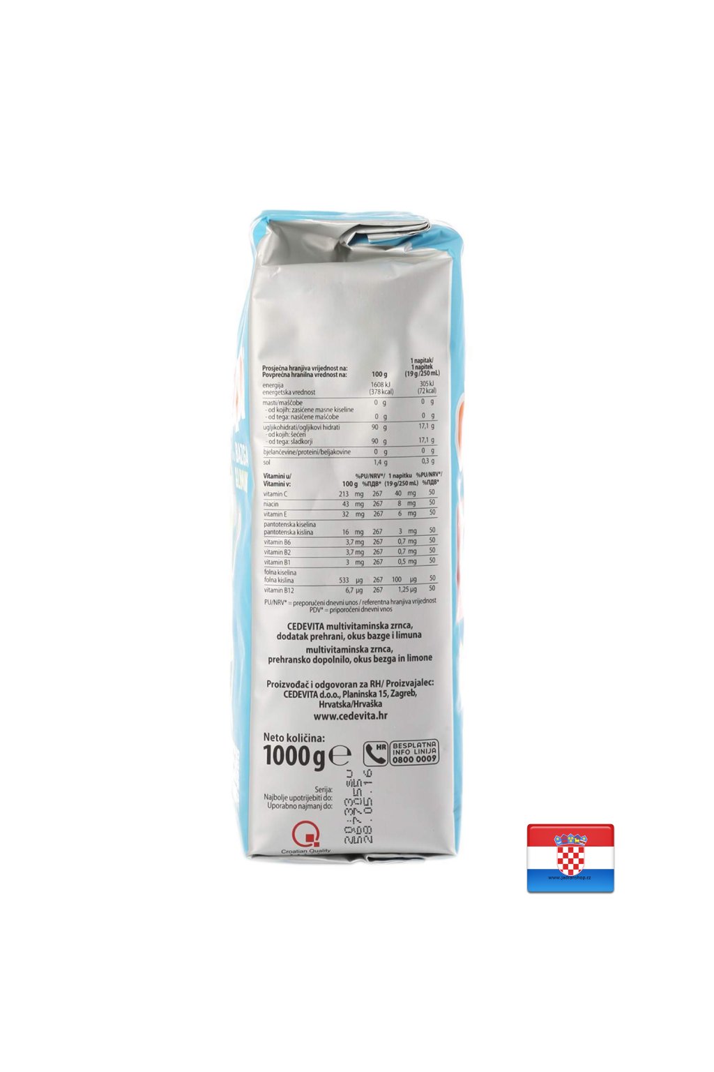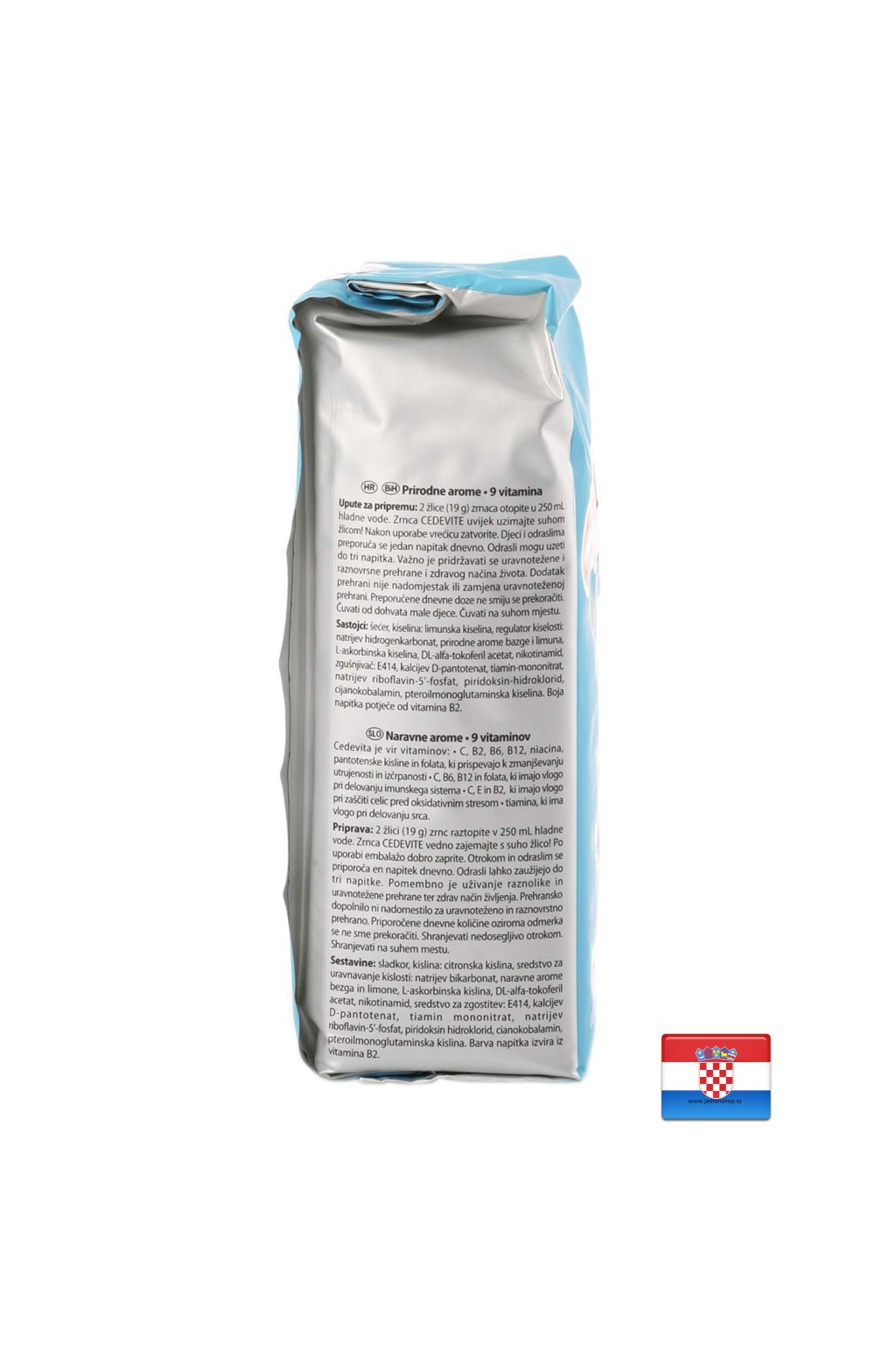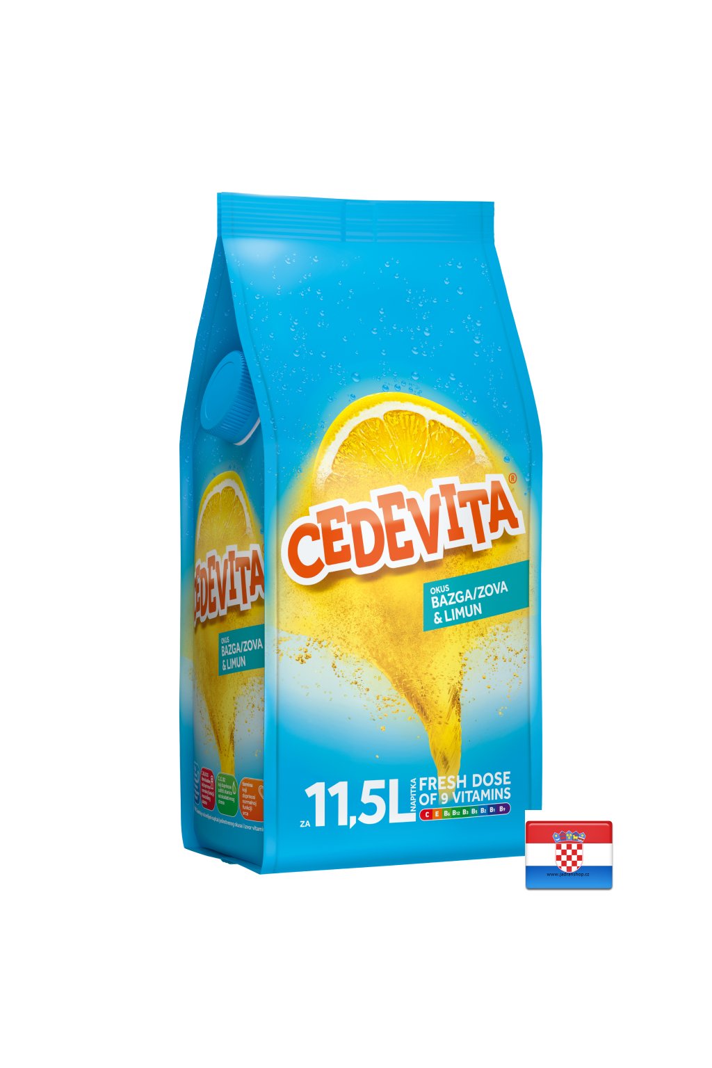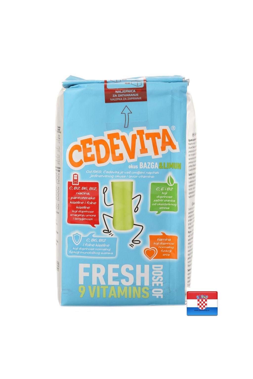 Přírodní aroma bezinky, citronu a 9 vitamínů. Celý sáček je na přípravu 13L - 15L nápoje. Od roku 1969 je Cedevita Vaším oblíbeným nápojem jedinečné chuti a zdroje vitamínů C, B2, B6, B12, niacinu, kyseliny pantothenové a kyseliny listové, které pomáhají při únavě a vyčerpání; C, E a B2, které přispívají k ochraně buněk před oxidačním stresem; Thiamin, který přispívá k normální funkci srdce; C, B6, B12 a kyselina listová, které přispívají k normální funkci imunitního systému.
