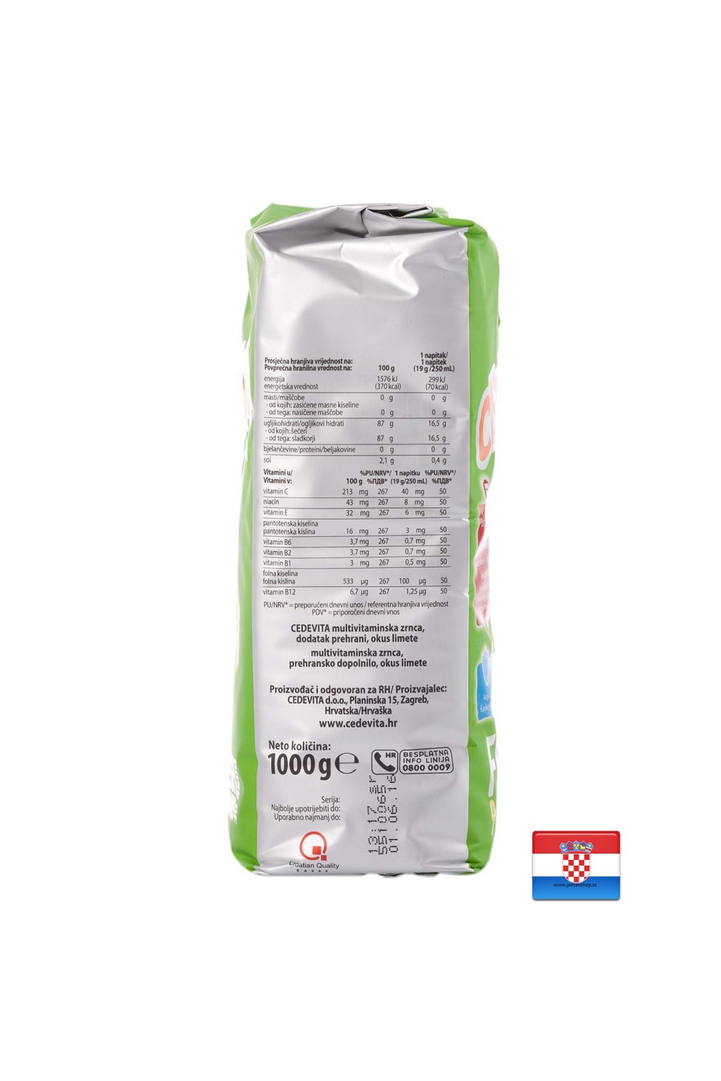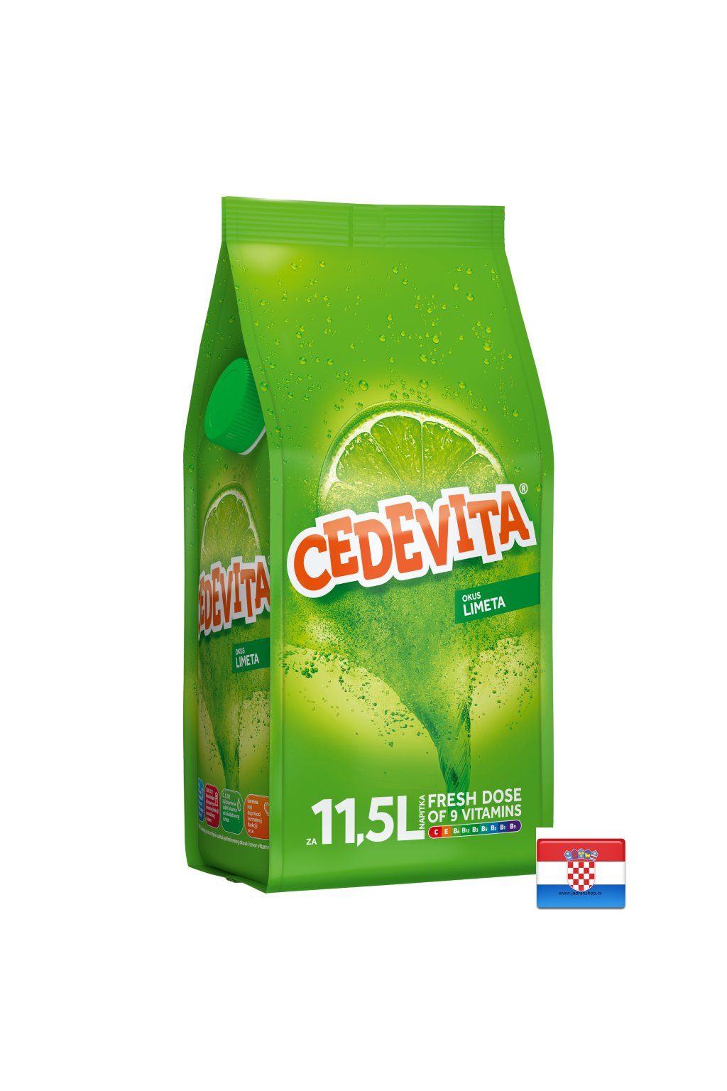 Přírodní aroma limetky a 9 vitamínů. Celý sáček je na přípravu 13L - 15L nápoje. Od roku 1969 je Cedevita Vaším oblíbeným nápojem jedinečné chuti a zdroje vitamínů C, B2, B6, B12, niacinu, kyseliny pantothenové a kyseliny listové, které pomáhají při únavě a vyčerpání; C, E a B2, které přispívají k ochraně buněk před oxidačním stresem; Thiamin, který přispívá k normální funkci srdce; C, B6, B12 a kyselina listová, které přispívají k normální funkci imunitního systému