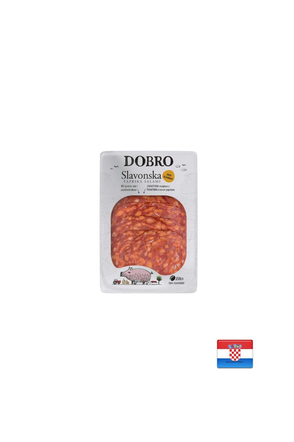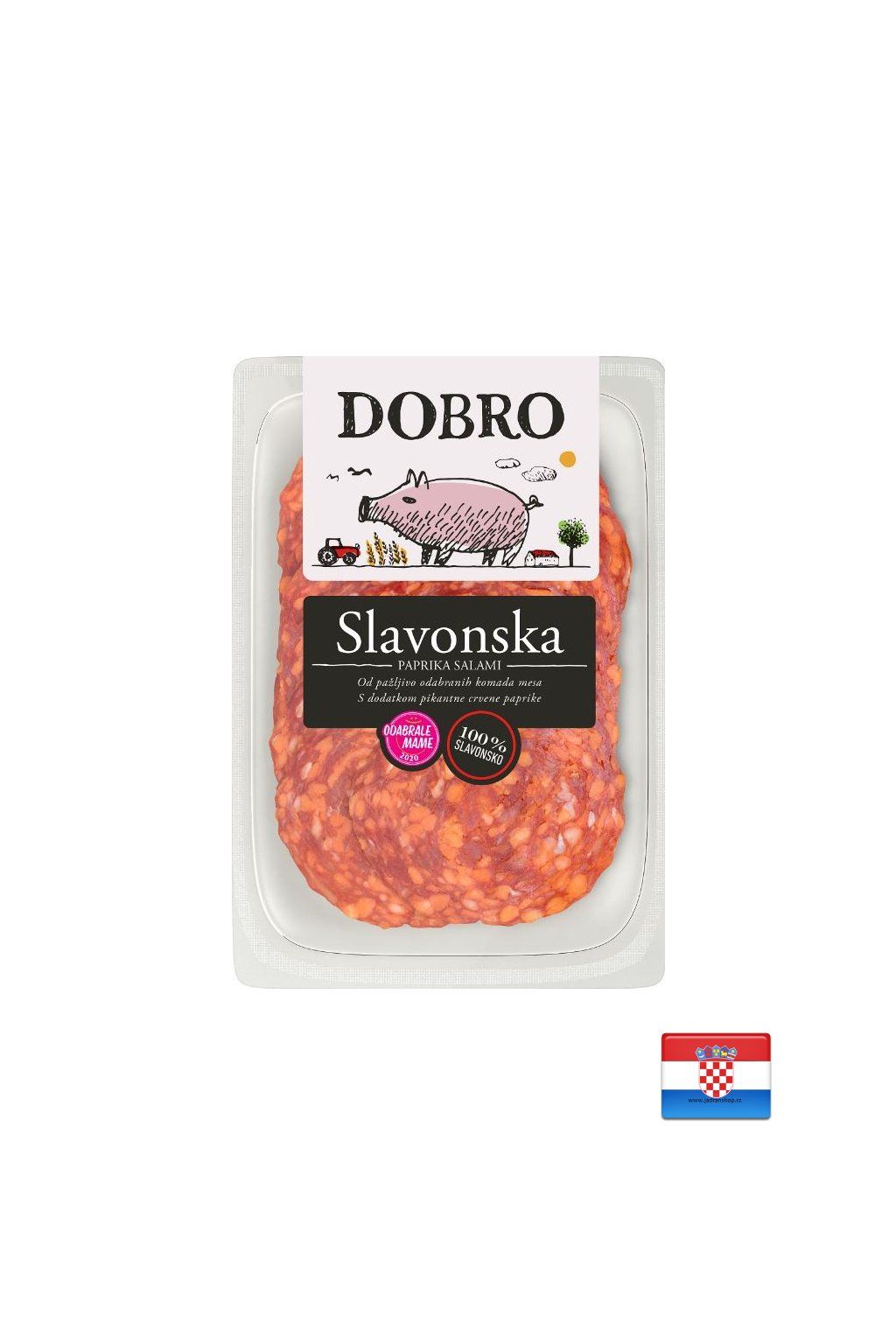 Slavonský salám Dobro má charakteristickou pikantně pikantní chuť, kterou mu dodává přidaná červená paprika a česnek.