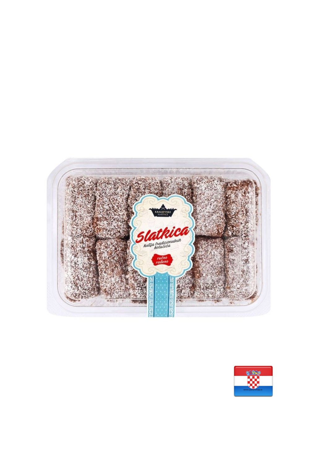 Cukr, MLÉKO, PŠENIČNÁ mouka, margarín (rostlinné tuky (palmový, kokosový), slunečnicový olej, voda, sůl, emulgátor: mono- a diglyceridy mastných kyselin; konzervant: kyselina sorbová; regulátor kyselosti: kyselina citronová, aroma, barvivo: karoteny), vaječné bílky ( VEJCE * konzervant: sorban draselný, regulátor kyselosti: kyselina citronová), slunečnicový olej, kokosová mouka, kakaový dresink [cukr, rostlinné tuky (palmojádrový, palmový, bambucké maso), kakaový prášek se sníženým obsahem tuku 15 %*, emulgátory: lecitiny, sorbitantristearát; přírodní aromata], prášek do pečiva [stabilizátor: difosforečnany, látka upravující mouku: uhličitany sodné; kukuřičný škrob, protispékavá látka: oxid křemičitý], rum.