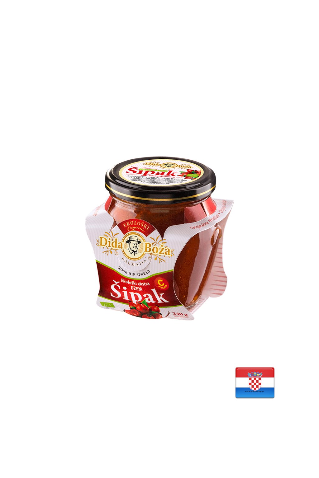 Složení: rose hio*, cukr*, voda, želírující látka: pektin, regulátor kyselosti: kyselina citrónová, antioxidant: kyselina askorbová.