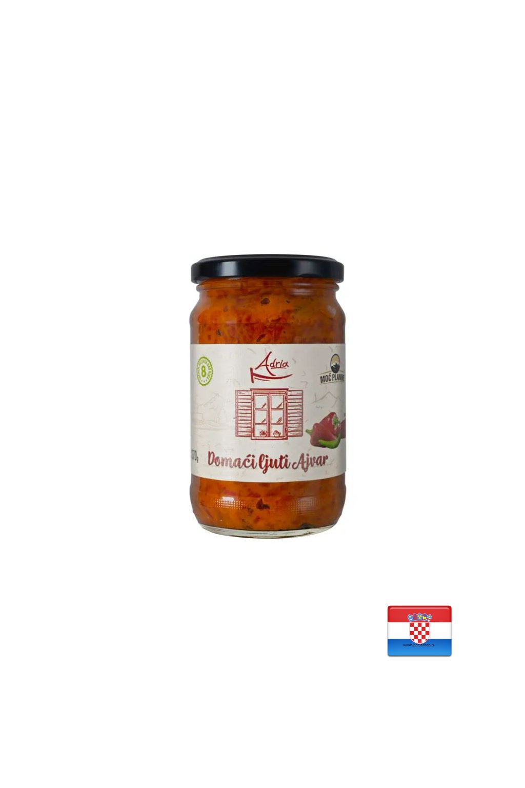 Adria jemný ajvar se vyrábí pouze z papriky, bez přídavku lilku a rajčat. Papriky se praží v menších 40litrových nádobách, ne ve velkých průmyslových hrncích, a loupou se ručně. Adria ajvar je pravý domácí ajvar vyrobený podle více než 100 let staré receptury s tradicí.