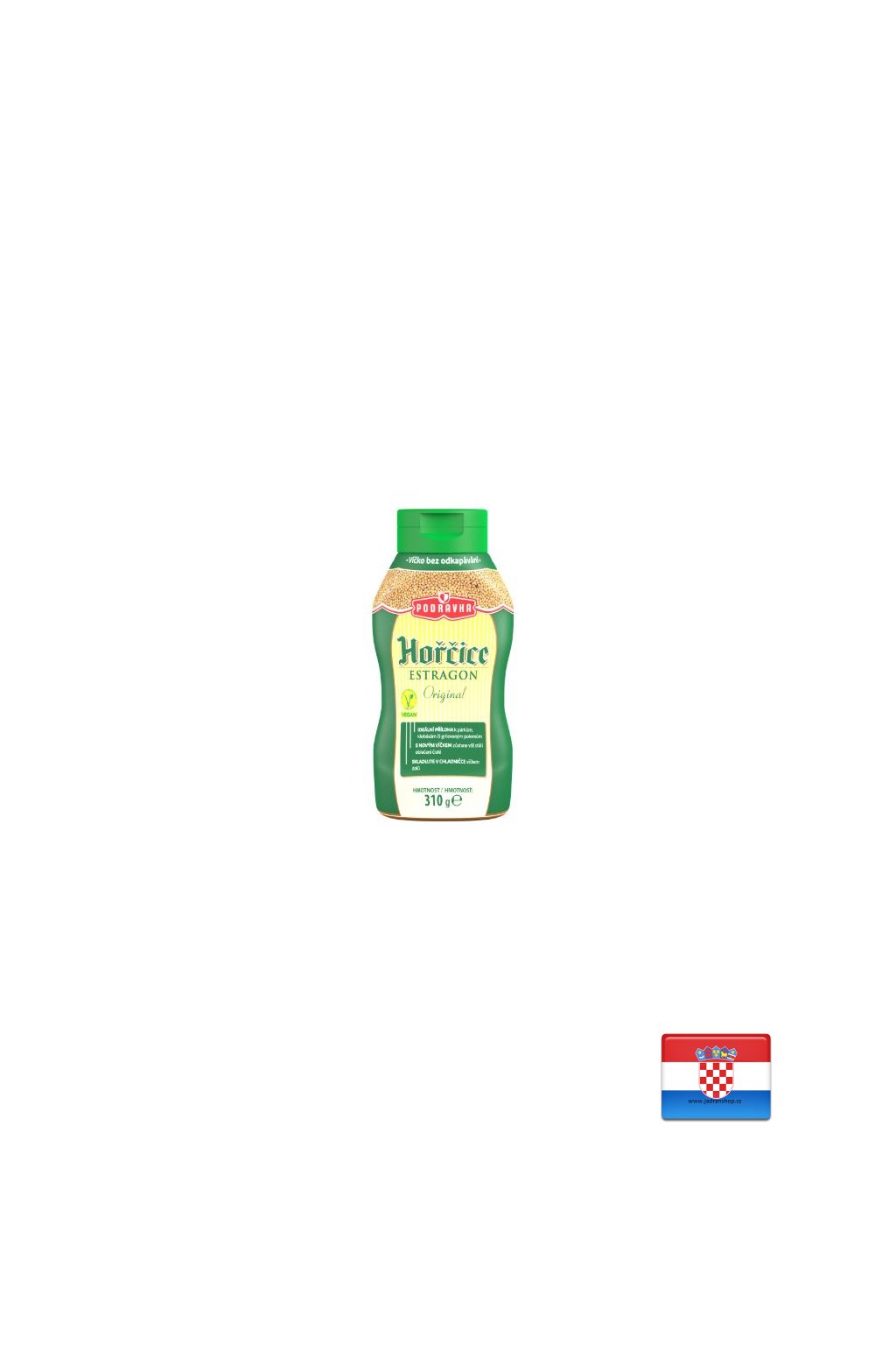 Složení: voda, hořčičná semínka (19 %), ocet kvasný lihový, cukr, jedla sul s jodem (jedlá sůl, jodičnan draselný), směs koření, barvivo: karamel, zahušťovadlo: xantanová guma, konzervant: sorban draselný, česnekové aroma, estragonové aroma (0,003 %).