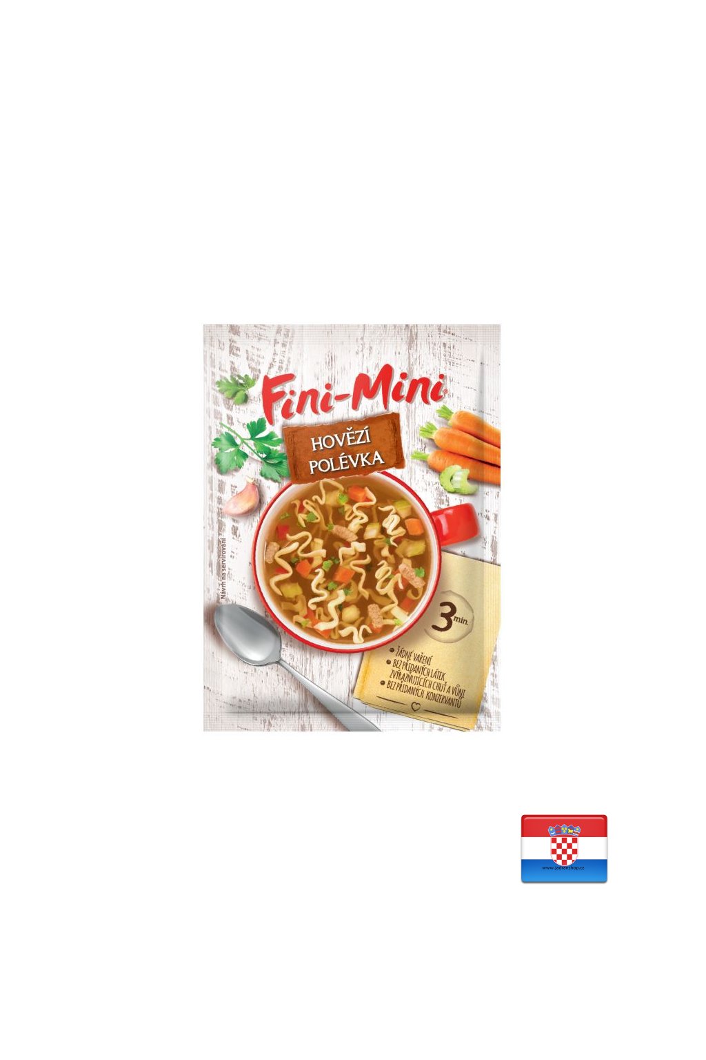 Obsahuje kousky hovězího masa, kořenovou zeleninu (mrkev a celer) a nudle z kvalitních těstovin z tvrdé pšenice. Stačí horká voda a můžete si vychutnat plnou chuť, lžičku po lžičce.
