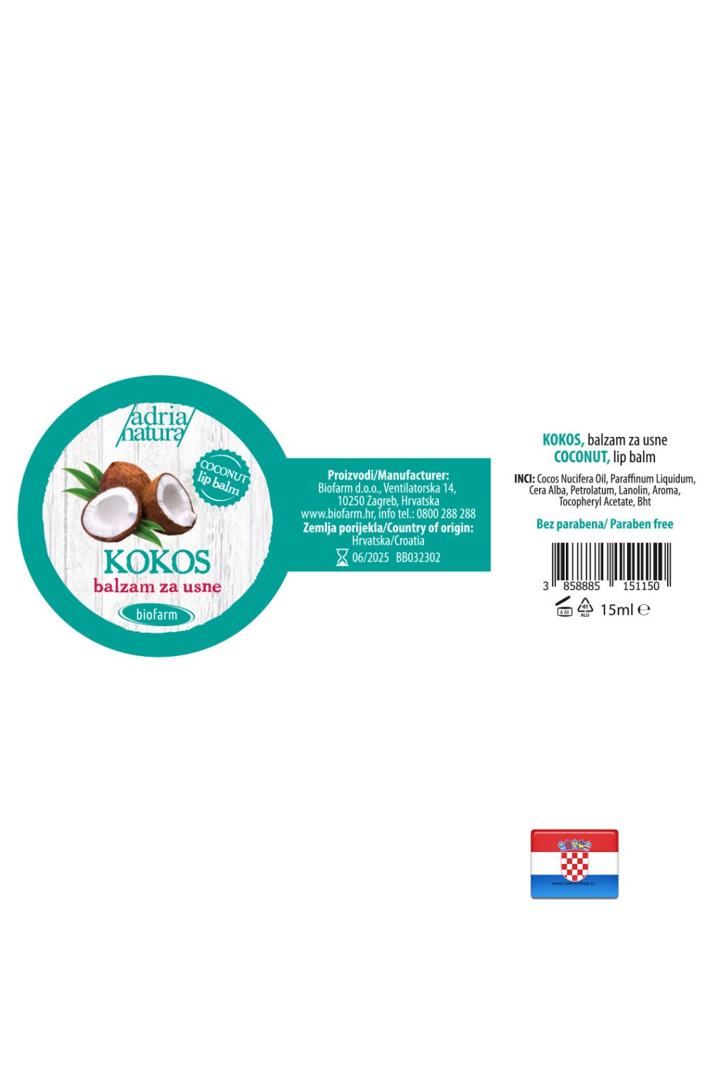 Složení (INCI): Cocos Nucifera Oil, Paraffinum Liquidum, Cera Alba, Petrolatum, Lanolin, Aroma, Tocopheryl Acetate, Bht.