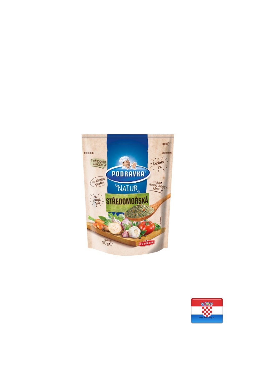 Návod k přípravě: Přidáme 1 lžičku (3 g) Natur Podravky Středomořské na 250 ml pokrmu v průběhu vaření.
