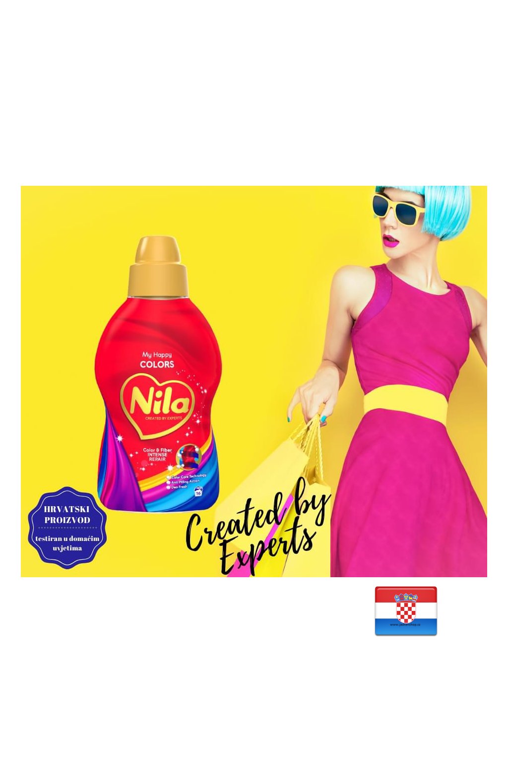 Oblečení intenzivních barev vyžaduje zvláštní péči. Nová NILA MY HAPPY COLOURS se speciálně vyvinutou recepturou COLOR & FIBER pro intenzivní ochranu, chránící barvy a vlákna oděvu zachovává brilantní barvy, zabraňuje tvorbě vrásek na látkách a obnovuje a vyhlazuje vlákna oděvu. Nila My Happy COLORS má moderní inspirativní vůni, která poskytuje zaoblený dojem výjimečné čistoty a kvalitní péče.