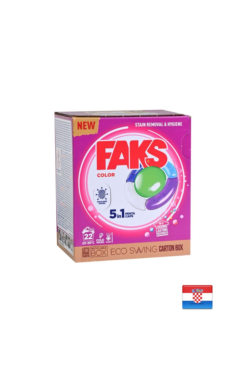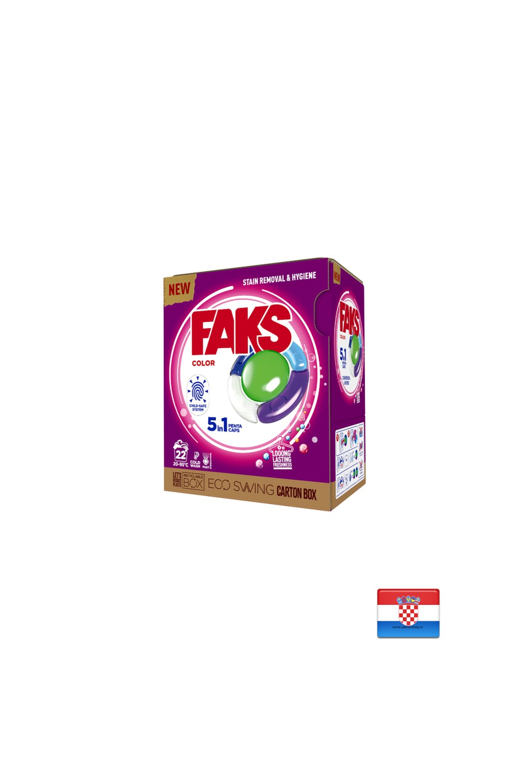 Kapsle Faks Color pro praní barevného prádla z bavlny, syntetiky a směsí při 20-95˚C.